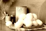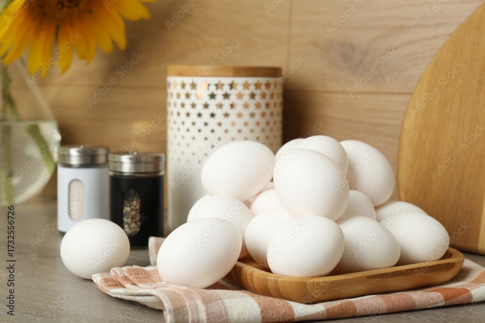 Raw chicken eggs and kitchen utensils on wooden countertop, closeup