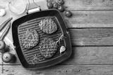 Pan with grilled patties, tomatoes and spices on wooden table, flat lay. Space for text