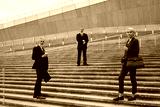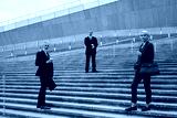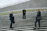 Three middle aged Caucasian business professionals standing on outdoor steps, two men and one woman wearing formal attire, holding briefcases, emphasizing career and ambition
