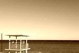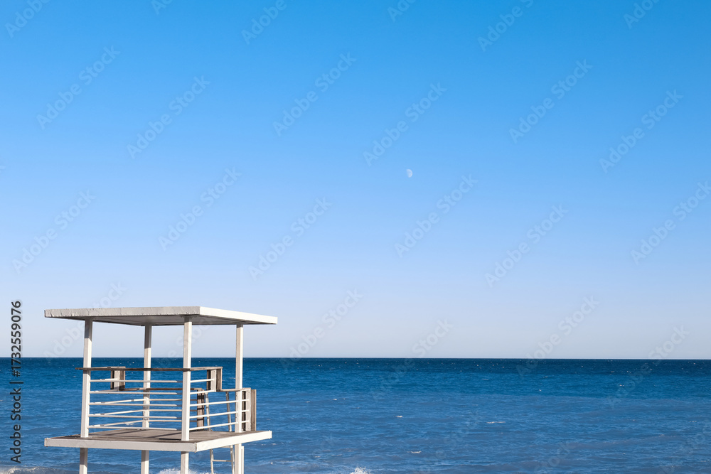 Beautiful view of wavy sea and lifeguard tower on sunny day