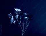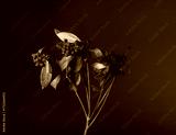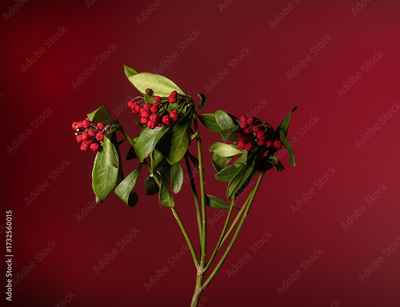 Branch with red berries and green leaves. Botanical composition on deep red background shows natural