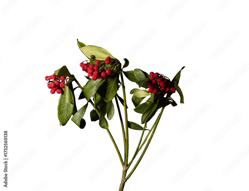 Branch with red berries and green leaves. Botanical composition on white background shows natural