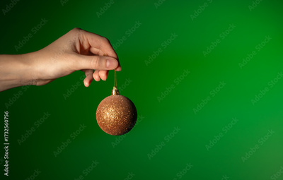Hand holding christmas ornament. Golden glitter bauble with shiny surface hangs as festive