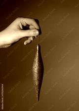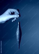 Hand holding red glitter ornament. Sparkling christmas decoration with elongated shape shines