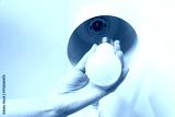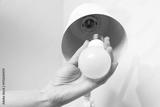 Woman changing light bulb in lamp near grey wall at home, closeup