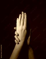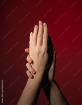 Hands with natural nails. Glossy neat manicure on red background shows care, elegance and beauty.