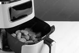 Air fryer with chicken nuggets on white table against blue background, closeup. Space for text
