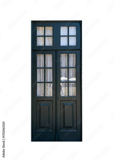 Old wooden door with glass windows and curtains, traditional architecture detail. Vintage entrance