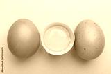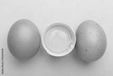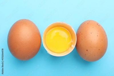 Whole and broken chicken eggs on light blue background, flat lay