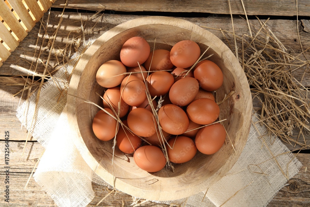 Raw chicken eggs in bowl and straw on wooden table, top view