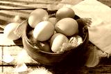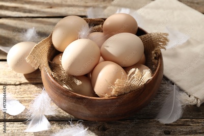 Raw chicken eggs in bowl and feathers on wooden table, closeup