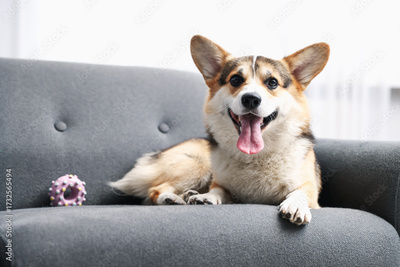 Cute Welsh Corgi with toy on couch at home