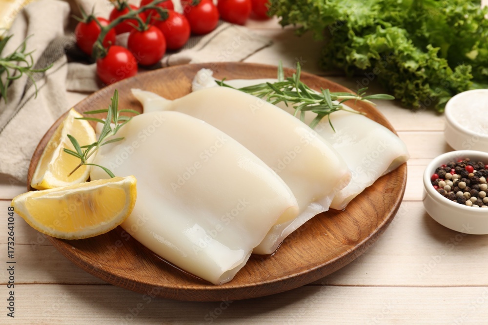 Pieces of raw squids with lemon and rosemary on light wooden table, closeup