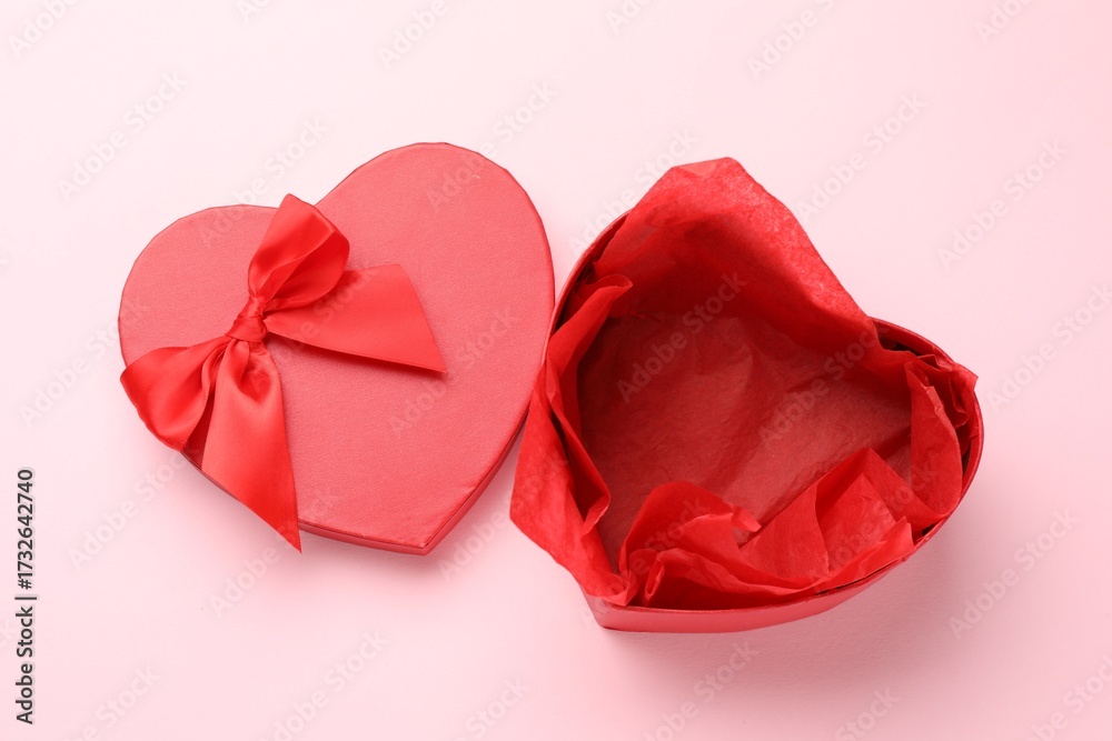 Heart-shaped gift box with beautiful lid on pink background, top view