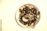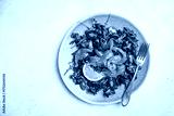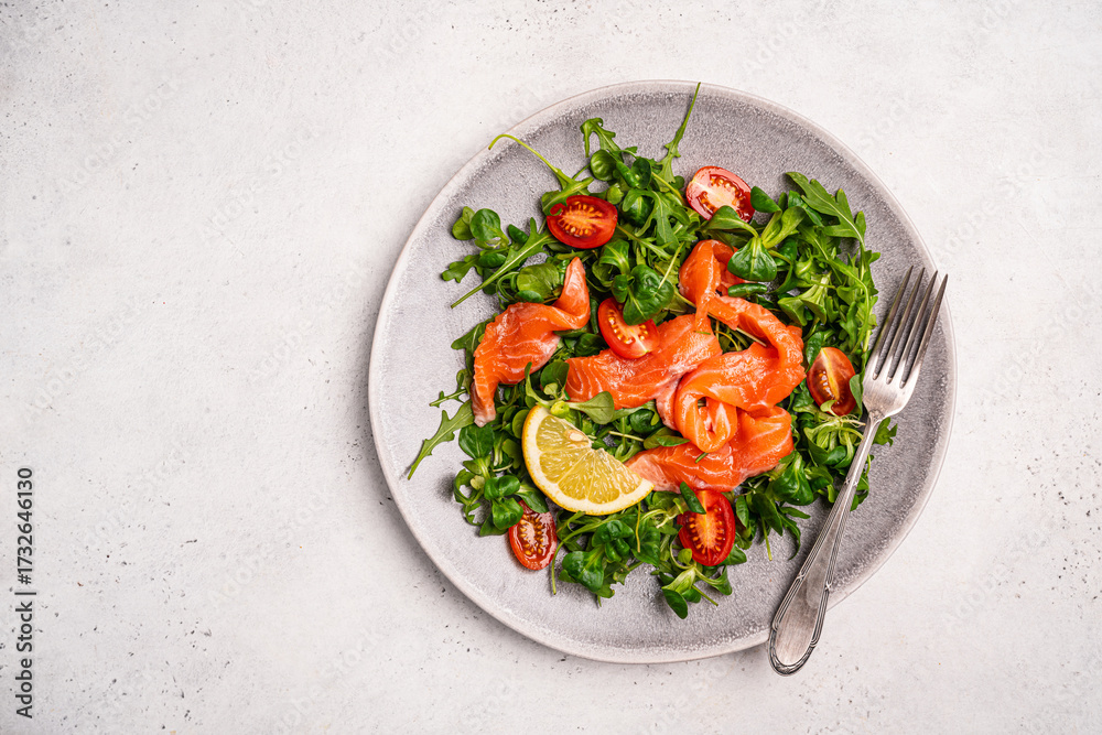 Fresh salad with salmon, green leaves, avocado and tomato on gray white background. Top view with copy space. Healthy food
