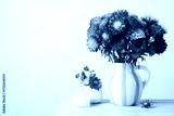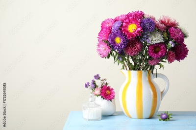 Beautiful flowers in vase on light blue wooden table against grey background. Space for text