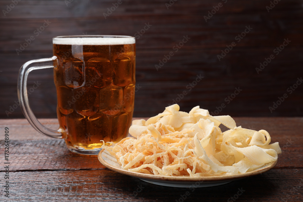 Glass mug of beer and dried squid shavings on wooden table, closeup