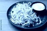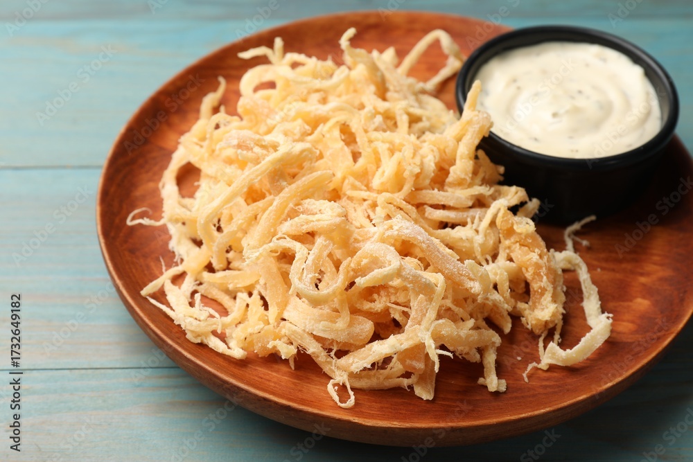 Tasty dried squid shavings and sauce on light blue wooden table, closeup
