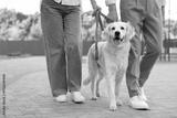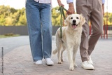 Senior couple walking with adorable Golden Retriever dog outdoors, closeup