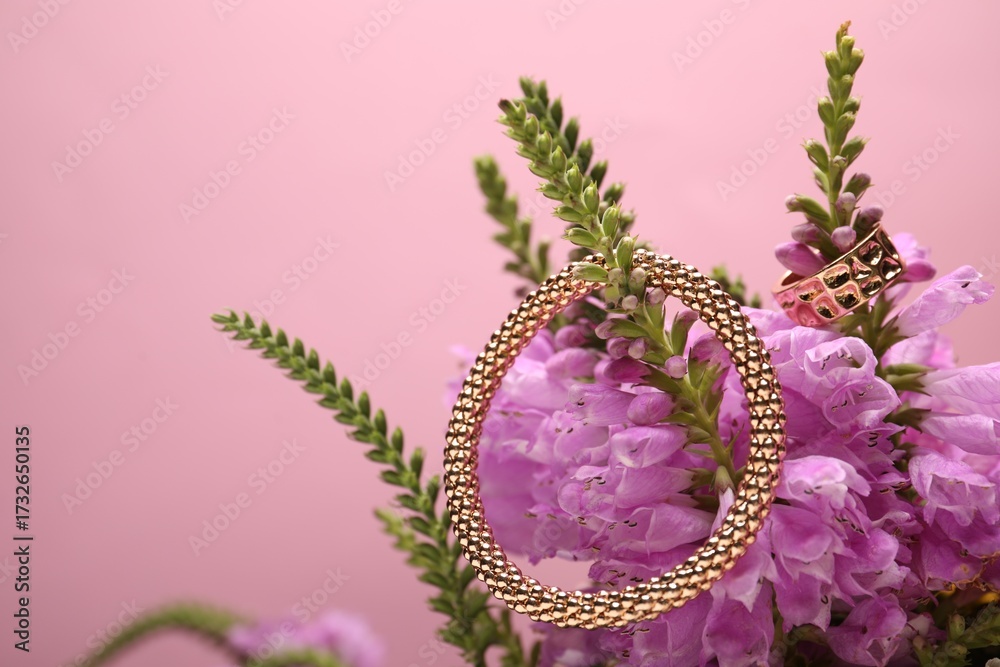 Stylish gold ring, bracelet and beautiful flowers against pink background, closeup. Space for text