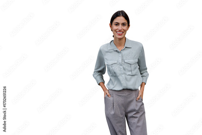 Young businesswoman smiling, showing confidence and professionalism. Ready for business, isolated with ample copy space