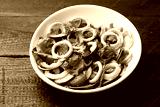 Delicious salad with squid rings, nuts and vegetables in bowl on wooden table, closeup
