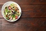 Delicious salad with squid rings, nuts and vegetables in bowl on wooden table, top view. Space for text