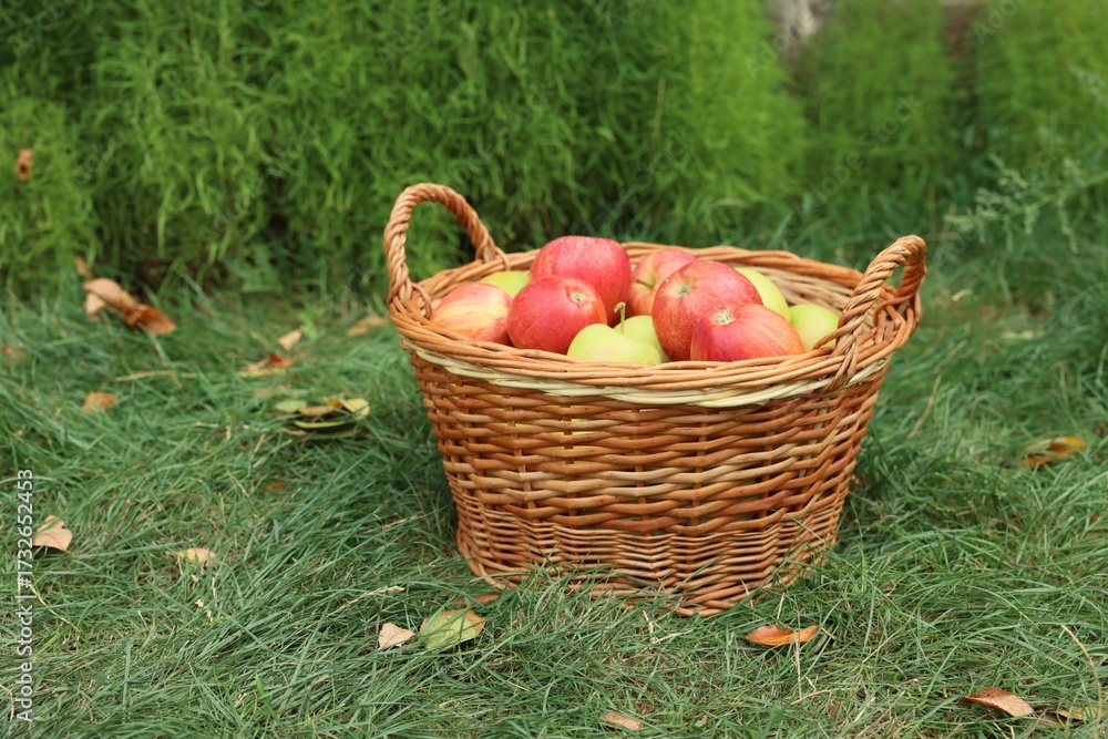 Fresh ripe apples in wicker basket and fallen leaves on green grass outdoors, space for text