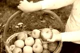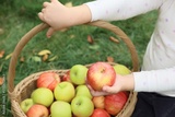 Child with wicker basket full of fresh ripe apples on green grass in garden, closeup