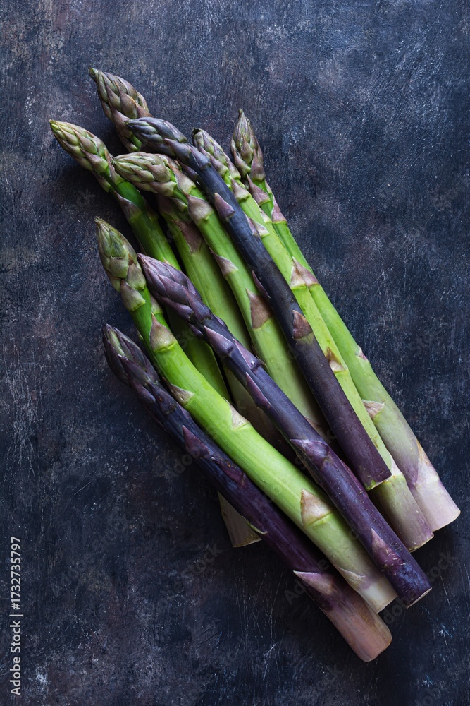 Purple, green asparagus on a dark background. Raw food concept. The vegetable is rich in fiber, natural prebiotic, low key.