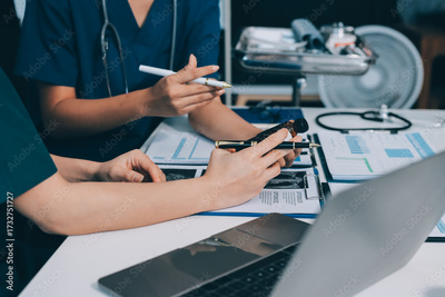 Two doctors and a female nurse meet at a table in the hospital, collaborating on medical tasks using laptops and computers