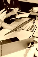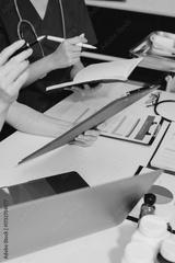 Two doctors and a female nurse meet at a table in the hospital, collaborating on medical tasks using laptops and computers
