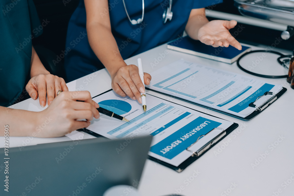 Medical team meeting analyzing blood test results in hospital laboratory. Doctors and scientists in lab coats are having a discussion about blood test result, holding test tubes and taking notes.