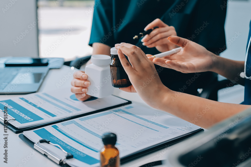 Medical team meeting analyzing blood test results in hospital laboratory. Doctors and scientists in lab coats are having a discussion about blood test result, holding test tubes and taking notes.