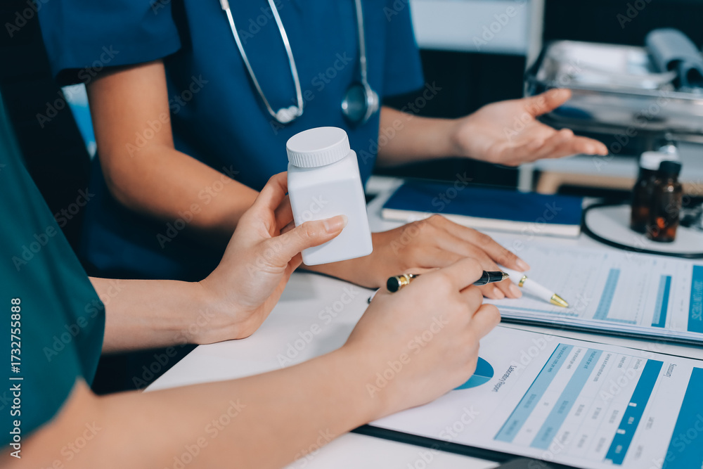 Medical team meeting analyzing blood test results in hospital laboratory. Doctors and scientists in lab coats are having a discussion about blood test result, holding test tubes and taking notes.