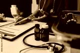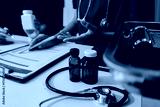 Medical team meeting analyzing blood test results in hospital laboratory. Doctors and scientists in lab coats are having a discussion about blood test result, holding test tubes and taking notes.