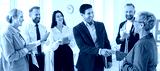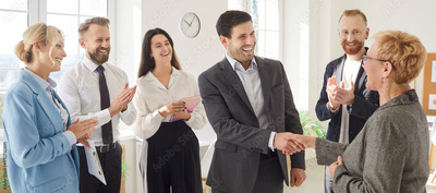 Group of professionals standing in office, shaking hands with female colleague or coach. Happy team applauding, greeting new employee, celebrating success or achievements in collaborative work. Banner