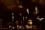 Witch with magic wand casts spell, cauldron, boiling magic potion, candles. Woman learns witchcraft from a book, magician girl with red hair, dressed in Halloween attire and conical hat