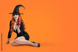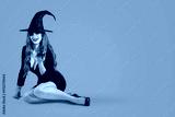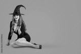 Witch on Halloween. Female wizard fairy character for All Saints' Day. Fantasy gothic red-haired Vampire girl in black dress. Enchantress dressed in carnival costume