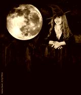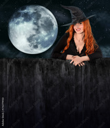 Witch on Halloween. Female wizard fairy character for All Saints' Day. Fantasy gothic red-haired Vampire girl in black dress carnival costume.