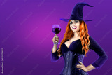 Halloween Witch drinking wine and having fun at the party. Female wizard fairy character. All Saints' Day. Fantasy gothic red-haired girl in carnival black dress