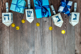Hanukkah background. Dreidel, with blue lettering נ nun, ג gimel, ה hei, ש shin, gift boxs, gold coins on wooden background. Jewish holiday of Hanukkah.