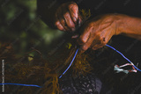 Selective focus on farmer's hands collecting seaweed at seaweed farm in Nusa Penida, Indonesia