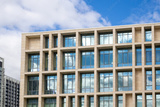 Facade of modern office building with square windows. Contemporary urban architecture with glass and concrete. Real photo