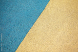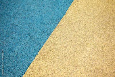 Sports or playground flooring with colorful rubber surface. Outdoor paving with contrast yellow and blue textured rubber. Photo