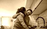 Affectionate daughter kissing her mother on the cheek while washing strawberries together in the kitchen at home