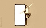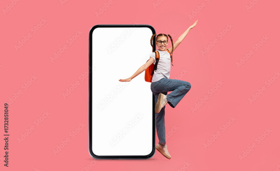 A girl wearing a backpack joyfully poses beside a large blank telephone screen. The pink background adds a playful element to the scene, showcasing her excitement and enthusiasm.