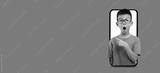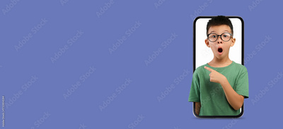 A boy with glasses looks surprised while pointing at a background featuring a telephone. The setting is colorful and engaging, capturing his excitement clearly.