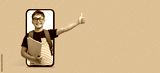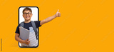 Boy with glasses smiles and gives a thumbs up while standing in front of a bright orange background. He holds school supplies and shows enthusiasm for learning and education.