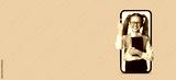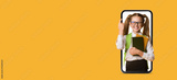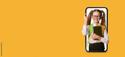 A young girl with glasses stands inside a smartphone screen, smiling widely. She holds a stack of books and a backpack, showcasing excitement and enthusiasm for learning.